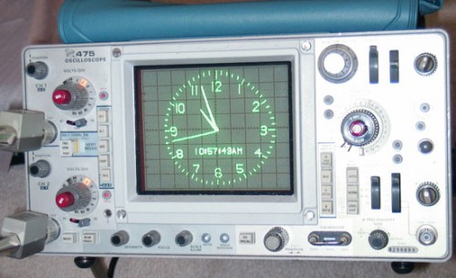 Projekt zegara wyświetlanego za pomocą oscyloskopu na bazie AVR. Układ wykorzystuje mikrokontroler ATmega168, a także ma możliwość komunikacji za pomocą portu RS-232. Układ zasilany jest napięciem 5V i podłączany bezpośrednio do oscyloskopu. Podobnie jak na załączonych zdjęciach na postawie wysyłanego sygnału umożliwia wyświetlanie na bieżąco obrazu zegara.