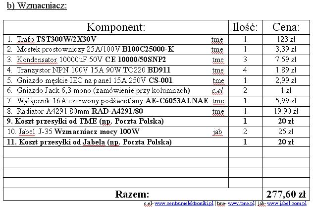Niżej wypisałem prawie wszystkie części i oszacowałem koszty (bez płyt na obudowy i obudowy na wzmacniacze), aha kosztorys robiłem na jeden zestaw.