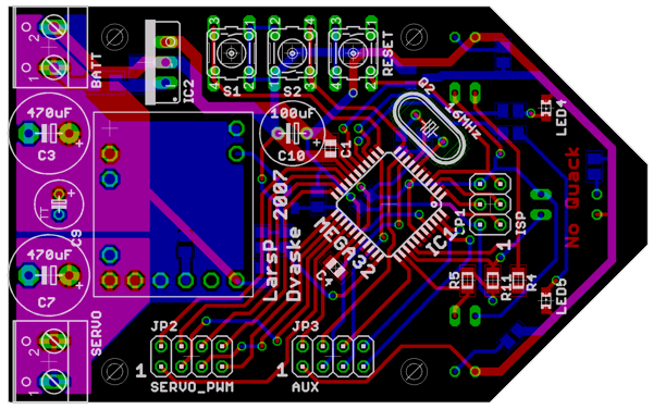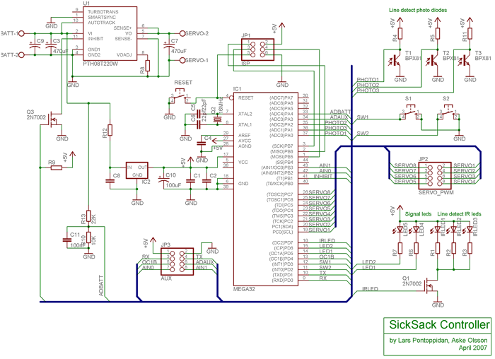 Sam kontroler wykorzystuje pojedynczy układ Atmega32. Mikrokontroler dał sobie radę z generowaniem ośmiu sygnałów dla serw bez zbyt dużego obciążania go.