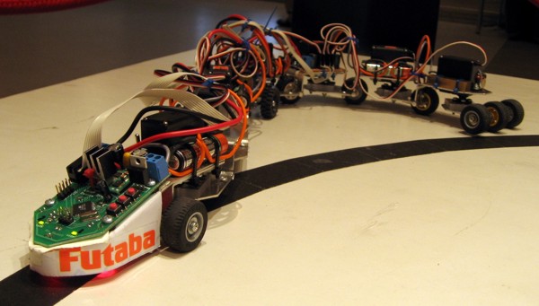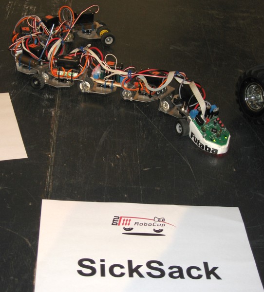 Tematem artykułu jest robot SicSack skonstruowany na potrzeby DTU RoboCup2007. Robot składa się z dziewięciu wagoników z ośmioma serwami Futaba sterowanymi przez mikrokontroler. Robot porusza się wzdłuż czarnej linii na wzór poruszania się się węża