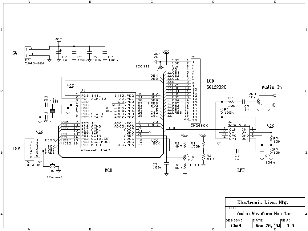 Układ służy do analizy źródła sygnału audio w czasie rzeczywistym. Całą prace wykonują Atmega8 oraz układ MAX293CPA, a wynik prezentowany jest na wyświetlaczu graficznym SG12232C.