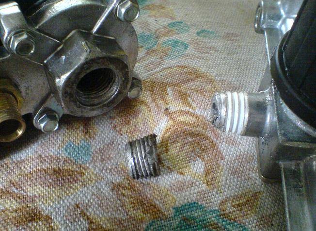 Przegwintować się raczej tego nie da. Nie wiem, co jest w tej prostokątnej podstawie i jaka jest grubość jej ścianki. Możesz obciąć ten króciec, rozwiercić otwór, nagwintować i wkręcić nowy kawałek rurki, już dobrze nagwintowany. Połączenie wzmocnić jakimś loctitem lub nawet czymś w stylu poxipolu, czy innego mocnego kleju.