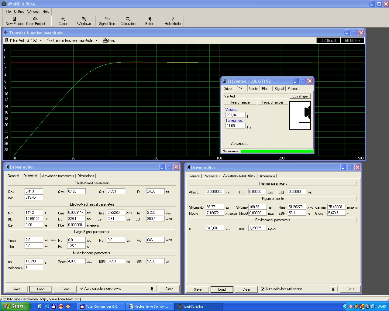 W chwili obecnej chciałbym go zaadoptować do nagłośnienia domowego. Robiłem symulację obudowy w WinISD i sugerowana przez program obudowa to ponad 293 litry a to trochę przesada. Próbowałem dopasowywać inną wilekość skrzyni ale zbytnio nie wiem czego lepiej się trzymać czy płaskiego wykresu w okolicy 0 dB, czy początku w którym charakterystyka osiąga 0 dB. Poza tym z tego co program sugeruje wynika że może to być obudowa zamknięta jak i równie dobrze z reflexem. Jeśli ktoś mógłby mi coś podpowiedzieć będę wdzięczny.