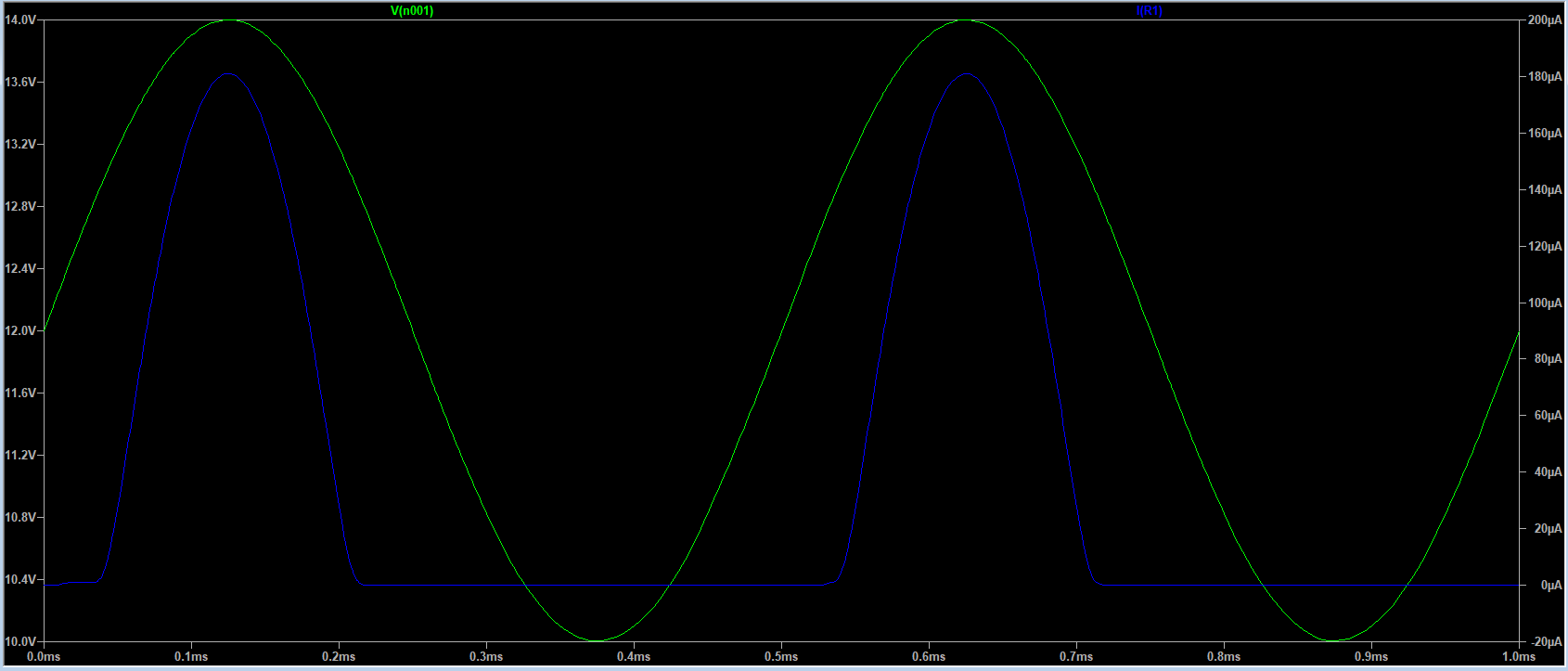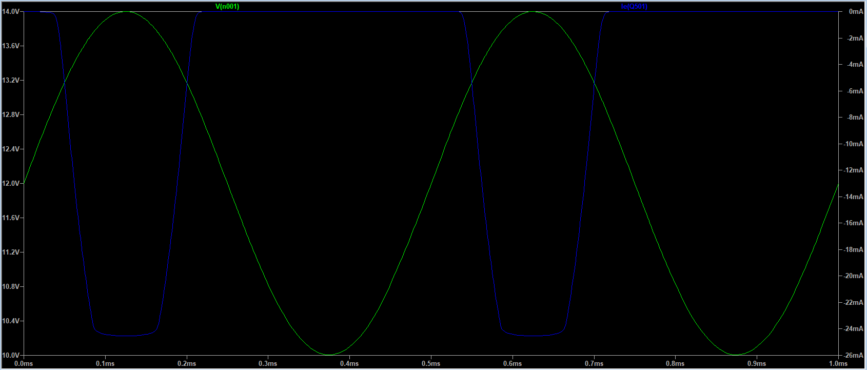 Wykresy napięcia zasilania V1 i prądu płynącego przez gałąź D1, R1 i emiter Q1