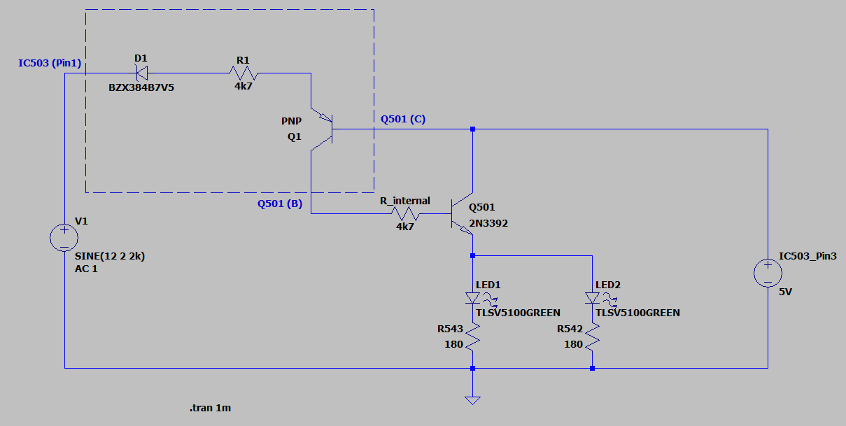 Fizycznie układ stabilizatora IC503 znajduje się na tej samej płytce, na której znajduje się tranzystor Q501 sterujący diodami podświetlenia. Na układzie IC503 znajduje się napięcia zasilania. Problem polegał na włączeniu Q501 dla napięcia zasilania większego od 12,5 lub 13 V. Testowałem w LTSpice połączenie wejścia stabilizatora IC503 do bazy Q501 przez rezystor lub przez szeregowy układ rezystancji i diody Zenera, jednak taki układ ma zbyt małą stromość i nie wyłącza podświetlenia dla napięcia zasilania około 12 V (prąd emitera to około 6 mA).