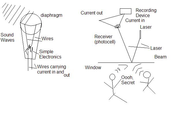 Autor proponuje stworzenie bardzo prostego podsłuch laserowego. sama zasad działania jest dosyć prosta. Wiązka lasera odbita od szyby, za którą podsłuchuje rozmowę, wraca (a raczej jej część) do fotokomórki, która przetwarza sygnał na elektryczny zależny od padającego światła.
