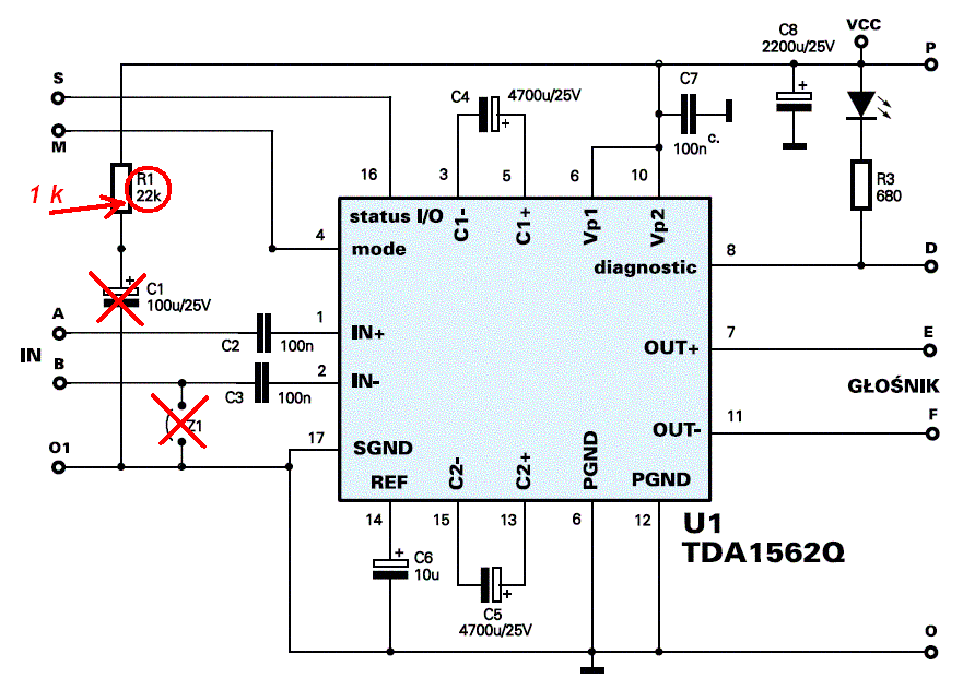 Mam problem z wzmacniaczem zrobionym na kostce TDA 1562Q. Mianowicie po wlączeniu dioda zapala sie na moment i gaśnie. To samo dzieje się przy wylaczaniu. Z glosnika slychac tylko trzaski. Gdy nie ma sygnalu na wejsciu. Gdy podaje sygnal na wejscie tez slychac tylko trzaski ale slychac ze sygnal audio dochodzi do wzmacniacza. Na nozke mode podaje napiecie 5V z stabilizatora, na nozke stat tak samo. Scalak raczej sie nie spalil bo nie grzeje sie az tak bardzo. Schemat znalazlem na elektrodzie, zamieszczam go ponizej. Jesli ktoś mial taki sam problem lub ma pomysl co to moze byc i jak moze mi pomóc bede wdzieczny za odpowiedź.