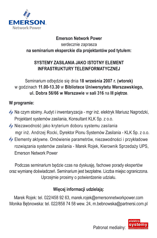 Marek Rojek: tel. 022/458 92 63, Marek.Rojek(_at_)EmersonNetworkPower.com