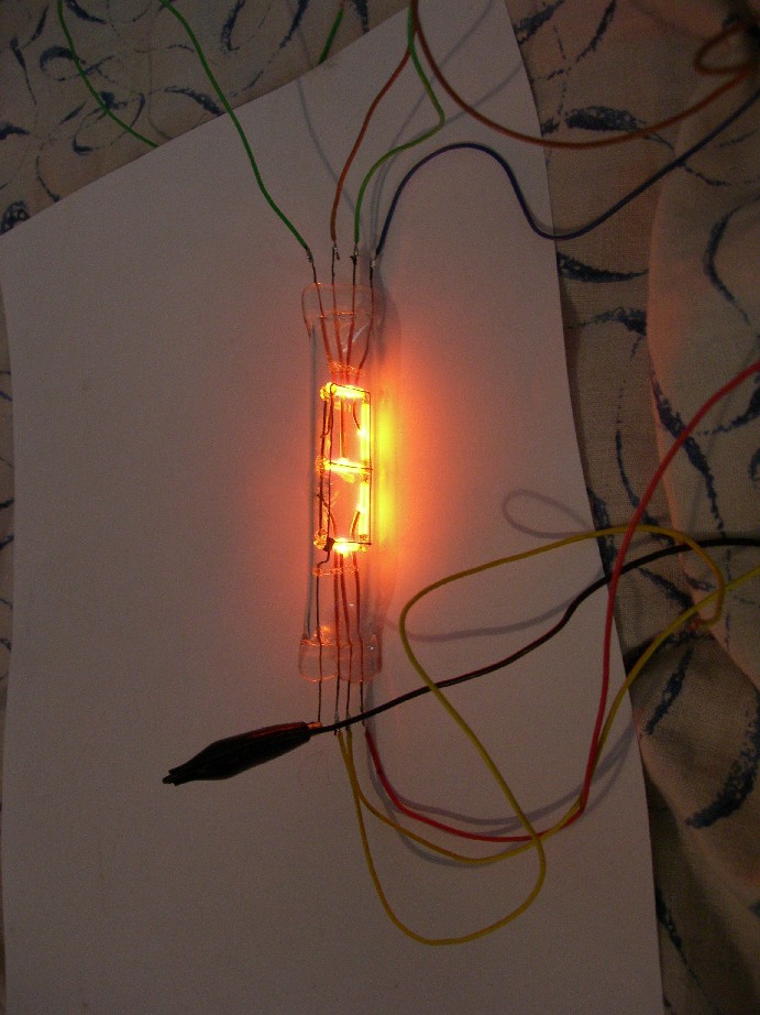 Tym razem chciałem pokazać lampę, która jest juz w stanie wyświetlić wszystkie cyfry. Jest to w zasadzie 7-segmentowa lampa nixie, o wysokości cyfry 4 cm.