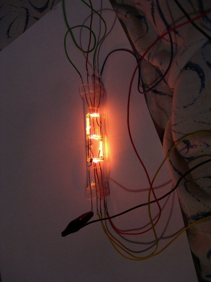 Ciśnienie gazu w lampie należy dość dokładnie dobrać. Na powyższych fotografiach ciśnienie to było jeszcze zbyt niskie, przez co cyfra "8" wydaje się być niewyraźna, jakby zamglona. Dlatego przed odtopieniem ciśnienie to zostało zwiększone. Wszystkie cyfry w lampie gotowej można sobie obejrzeć poniżej: