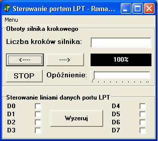Projekt ktorym chce sie Wam pochwalic to projekt ktory wykonalem w ramach specjalizacji programowanie w technikum elektronicznym. W ramach projektu napisalem program do sterowania portem LPT - sterowanie poszczegolnymi pinami jak i sterowanie silnikiem krokowym bipolarnym. Caly projekt dokladnie opisany jest w pliku PDF ktory jest juz zamieszczonyna mojej stronie wiec podam tylko adres i zapraszam wszystkich chetnych do testowania.