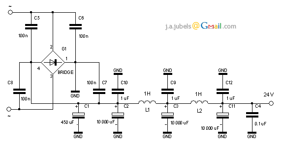 Źródło zasilania wymagało pewnych zmian. W mostku prostowniczym użyto diod BYW 29/100. Wokół diod rozmieszczono kondensatory 100 nF do filtrowania szumów podczas przełączania. Kondensatory 1 uF zostały umieszczone równolegle z kondensatorami 10000 uF w celu filtrowania. Zresztą całość jest przedstawiona na schemacie.