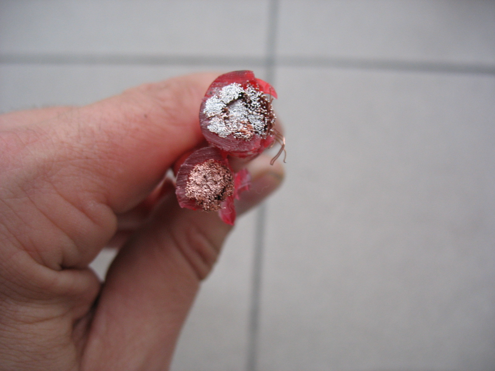 Oba rdzenie miedziene ( ze stare 21mm1 i nowe 35mm2 ) z boku wygladaja tak samo, kolor miedzi taki sam ale w przekroju nowe kable sa prawie srebrne a te stare w przeroju maja taki sam kolor jak z boku.