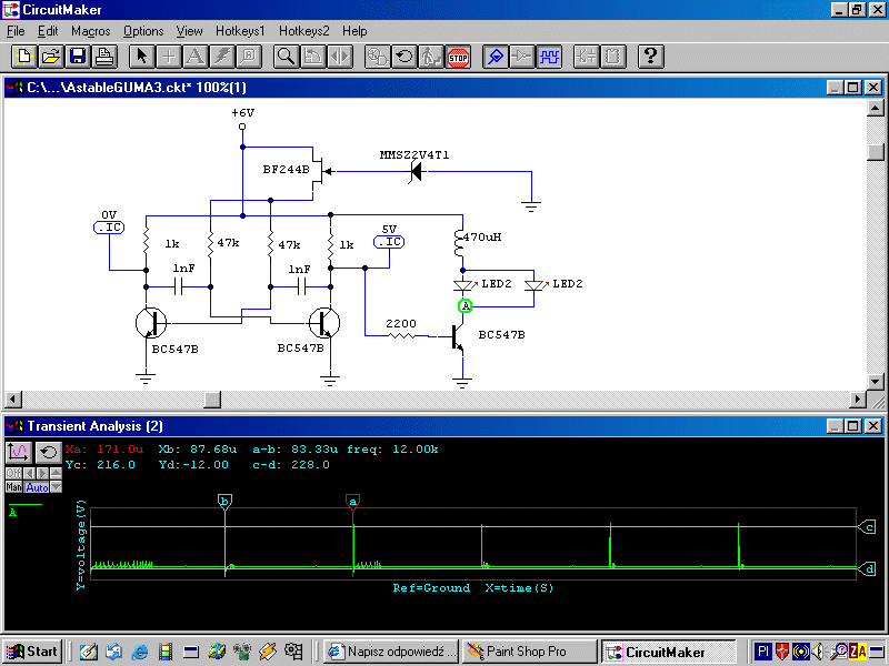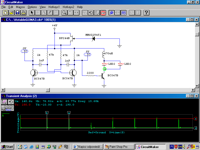 - o w miarę wysokie wzmocnienie prądowe tranzystora: T2 - wybrałem z kilku o najwyższym hFE = 195.