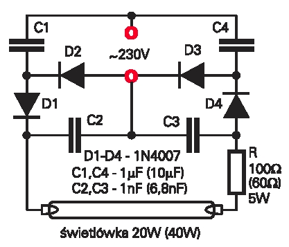 Z inną wersją turystycznej świetlówki spotkałem się też w jednym z numerów Młodego Technika, ale nie znam rocznika ani numeru. Schemat opisany jest także w książeczce,,Proste układy elektroniczne'' - Biblioteka Młodego Technika wydanej przez Instytut Wydawniczy,,Nasza Księgarnia'' w Warszawie w 1984 roku.