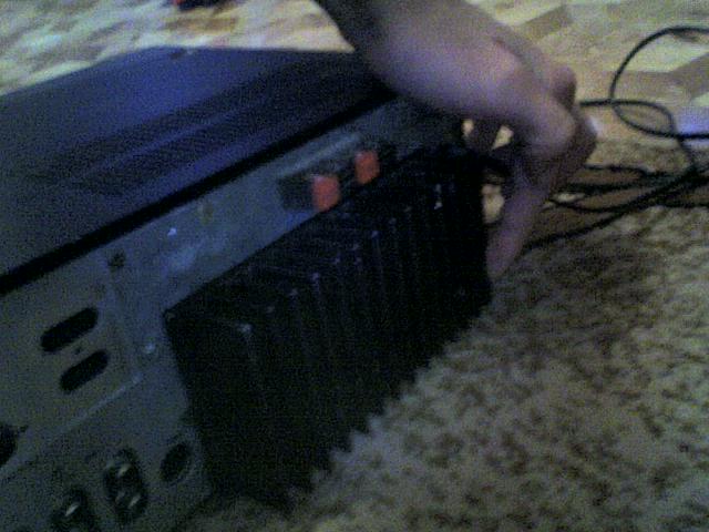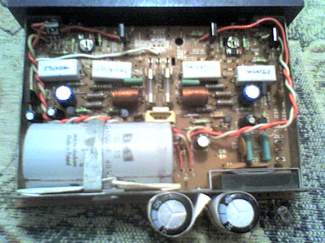 Wiem że te elwy są stare ale jak narazie działają to pozostawiłem, teraz zamierzam wywalić elwe i wstawić dwa kondensatory po 10mF/50V. Wzmacniacz ładnie gra przy 4R ale już przy większych mocach nie daje sobie rady transformator ponieważ bardzo przysiada napięcie, jeszcze gorsza sytuacja jest przy 2R i diody led niemal całkiem przygasają co można traktować jako wskażnik wysterowania. Zamierzam zamiast transformatora sieciowego wstawić zasilacz impulsowy. Będzie miał większą moc i mniejsze rozmiary oraz lepszą sprawność. Te elektrolity nie wiszą tylko są blaszaną łapką przykręcone. Co do mocy mocy wyjściowej to szacuje to na 2*50W RMS przy 4R i 2*35W RMS przy 8R, a przy 2R nie sprawdzałem bo zasilacz ma za małą wydajność mcy i rosną zniekształcenia dzwięku. Orginalnie pobierał z sieci z 170VA (90W), a teraz po zmianie impedacji obciążenia napewno więcej pobiera z sieci.