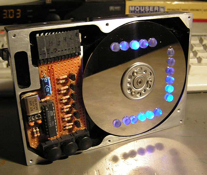 Poniżej projekt zegara binarnego w obudowie po starym dysku twardym. Pomimo małej ilości miejsca w obudowie po dysku twardym, autor zdecydował się na montaż przewlekany. Projekt wykorzystuje dwa rejestry 6 bitowe przeznaczone na sekundy i minuty oraz jeden 5 bitowy na godziny. Diody wyświetlają kolejno na górze godziny, z prawej strony pionowo minuty , a poziomo na dole sekundy.