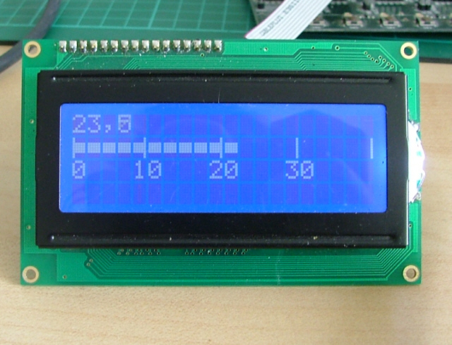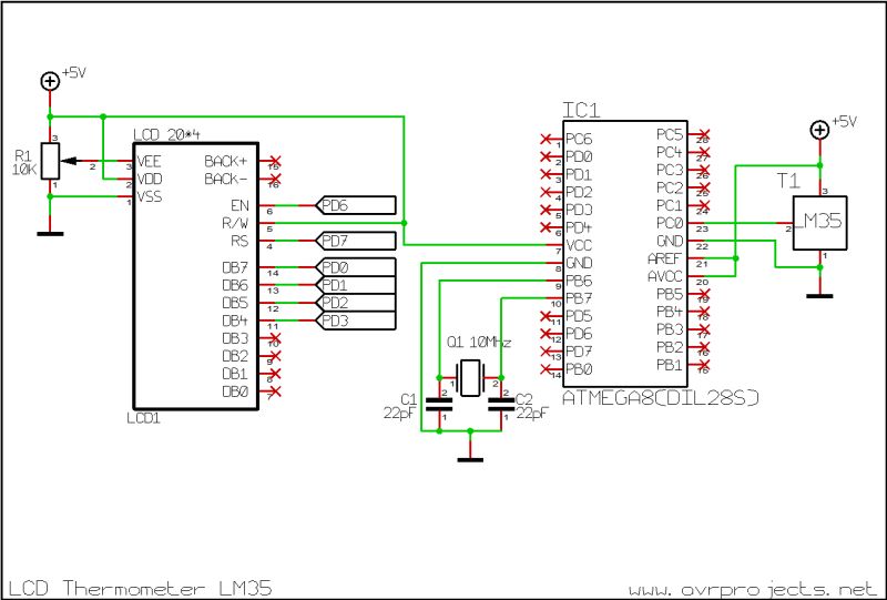 Układ LM35 firmy National Semiconductors to precyzyjny czujnik temperatury, który dysponuje analogowym wyjściem. Zakres pracy urządzenia to -55ºC di 150ºC z dokładnością ±0.5ºC.Napięcie wyjściowe zmienia się 10mV/ºC. Sygnał wyjściowy jest podany na przetwornik analogowo-cyfrowy wbudowany w układzie Atmega8. Temperatura jest wyświetlona na panelu LCD. W tym przykładzie czujnik pracuje w zakresie temperatur 0ºC do 40ºC z rozdzielczością 0.5ºC. Jeżeli ktoś chce mieć odczyt w Fahrenheit'ach to może użyć zamiast tego czujnika, LM34.
