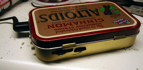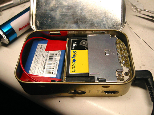 Poniżej projekt odtwarzacza mp3 zamkniętego w obudowie po Altoidach (szkoda, że u nas takich nie ma). Urządzenie zbudowane jest w części na samplach, co znacząco obniżyło jego koszt. Obsługuje karty compact flash i odczytuje pliki z FAT16. W przeciwieństwie do wielu podobnych projektów w tym występuje regulator podbicia basów zasilany tylko z 3.3V i nadajnik FM na wypadek braku kabelka lub kasety-emulatora do radia w samochodzie.