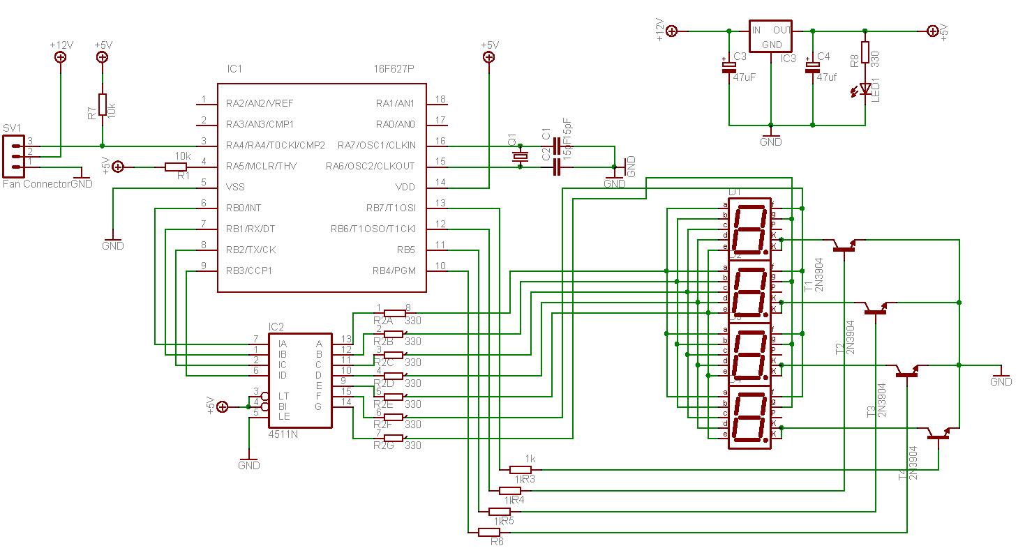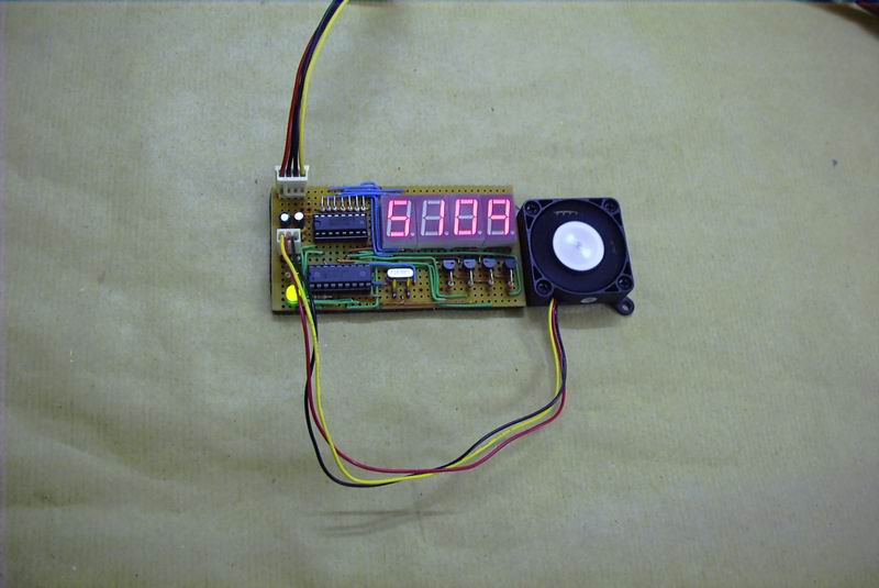 Jednak autor zbudował urządzenie samodzielne mogące mierzyć wentylatory, be potrzeby montowania ich w komputerze na potrzeby znajomego. I tak powstał na bazie PIC16F627 Tester prędkości obrotów wentylatora. Wartość jest wyświetlana w obrotach na minutę na czterech wyświetlaczach siedmio-segmentowych, jak widać na rysunku.