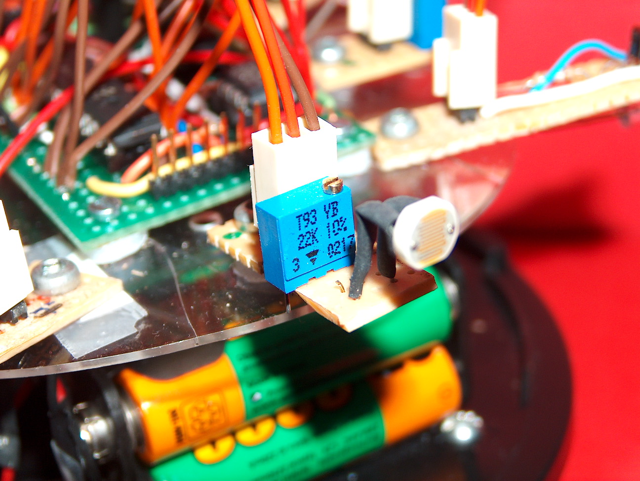 Sam robot zbudowany jest na pudełku po płytach DVD. Porusza się dzięki dwóm silnikom DC kontrolowanych przez TC4427A. Robot używa kilku czujników, do komunikowania się z otoczeniem. Są to czujnik światła i odległości zbudowany z diod podczerwonych LED. Ruch robota może odbywać się poprzez kierowanie nim wiązką światłą albo może sam uczyć się poruszać. Jest ciekawsze, bo wtedy robot wykorzystuje prosty algorytm Q-learning do nauki poruszania się. Algorytm po prostu nagradza za każdym razem gdy wzrasta intensywność światła obserwowanego. Za każdym razem gdy robot dokonuje wyboru aby poruszać się prosto zamiast kręcić się w kółko.