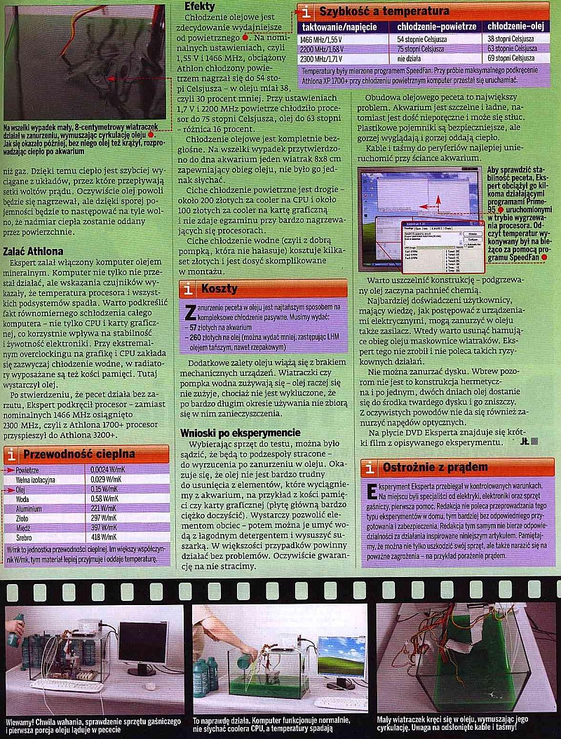 /|\Atari napisał: Czy to skróci żywotność zasilacza? Owszem - ponieważ żaden producent nie produkuje standardowych kondensatorów low esr z myślą o zanużaniu ich w cieczach. A co jak Ci taki kond walnie i puści elektrolit do oleju? I taka strużka elektrolitu popłynie sobie w kierunku innego elementu który już np. na wysokim napięciu będzie pracował albo będzie to wogóle element strony pierwotnej? Kondensatory nie są idealnie hermetyczne (tylko oscony widziałem od spodu zalane żywicą, a nie zakorkowane gumą). Ich awaryjność w dzisiejszych czasach to też spory problem, wiem bo przegryzłem troche zasilaczy i nawet w tak teoretycznie dobrych PSU jak Antec czy Chieftec potrafi siedzieć... że się tak wyraże... Guano... Dla mnie W/C to skrajność, ale ten olej to już głupota. Wizualna ciekawostka na pare H, na jakieś targi, ale nie coś na czym można pracować. Tak jak też koledzy wspomnieli to i olej Ci się po pewnym czasie zagrzeje. Ostatecznie ten olej ma niską przewodność. Ale napewno nie dorównuje pod tym względem powietrzu. Wystarczy że się pojawią jakieś śmieci rodzaju elektrolitycznego i już to będzie szło na łeb. Daje sobie głowe uciąć, że nawet nie przewidywałeś tych rzeczy. Jak zresztą spora część overclockerów nie przewiduje konsekwencji dla sprzętu, dopiero po fakcie przychodzi nauka gdy coś się uwędzi. Z tym że tutaj to już ryzykowniejsza zabawa, bo mieszasz z 230V AC.
