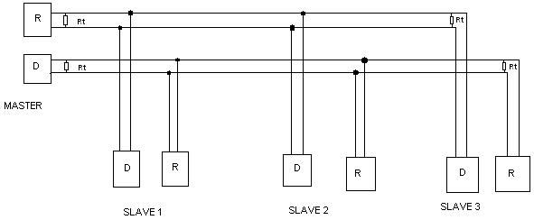 Kiedy sieć składa się z urządzenia MASTER i 1 dowolnego urządzenia typu SLAVE komunikacja odbywa się bez problemu. Natomiast kiedy sieć składa się z urządzenia MASTER i 2 lub 3 urządzeń typu SLAVE, to żadne z nich nie odpowiada. Schemat topologii sieci załączam poniżej.