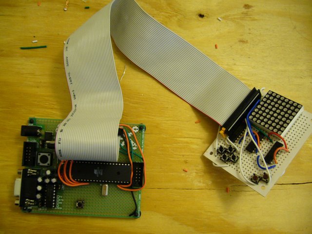 Elementy można łątwo dostać, nawet matrycę diod 8x8 (jest dostępna na allegro za ok 12zł). Pozostałe elementy to mikrokontroler ATmega32 i multipleksery.