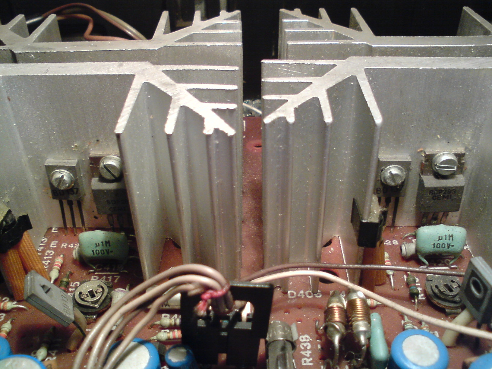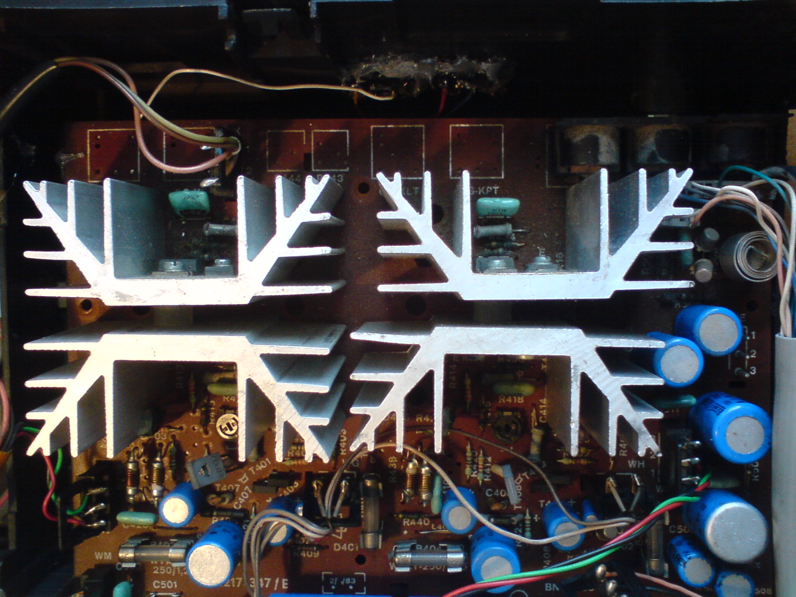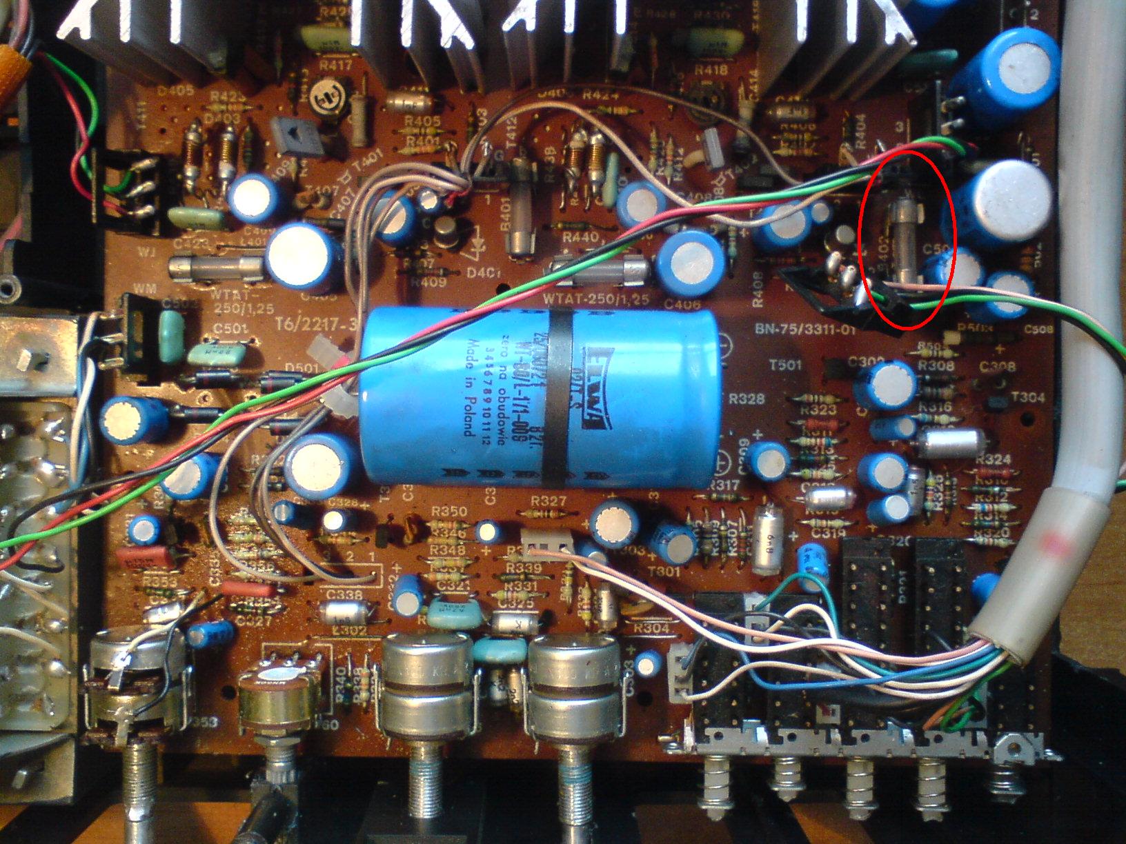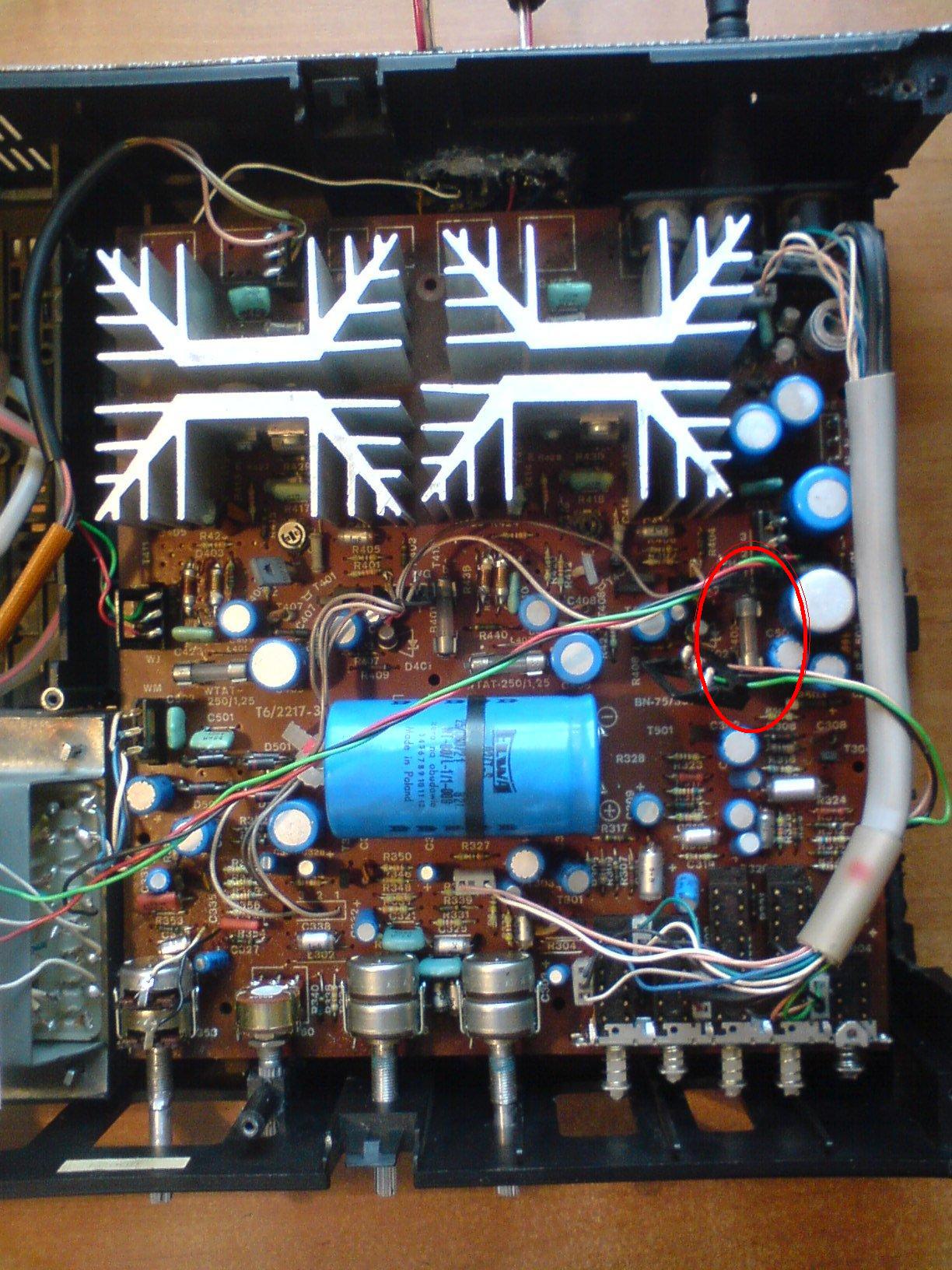 Witam. Bawiłem się trochę w budowę własnej obudowy do wzmacniacza od Zodiaka DSS 402. Calkiem fajnie mi szło do czasu jak postawiłem do pionowo i prawdopodobnie obudowa złączyła dwa radiatory i była zwara. Przestał grać mi jeden głosnik, rozkręciłem obudowe i byl przepalony jeden bezpiecznik (zaznaczony na zdjęciu). Zastąpiłem go kabelkiem, podłączyłem i głosnik gra, tylko mocno charczy i dźwięk jest słaby. Podczas przepalenia zaczęło coś śmierdzieć spaloną elektroniką ale nie wiem czy to nie śmierdział ten bezpiecznik. Mógłby mi ktos powiedziec co zjarałem i co należy wymienić żeby grało tak jak dawniej? Dodam, że drugi głosnik (lewy) gra bardzo dobrze.